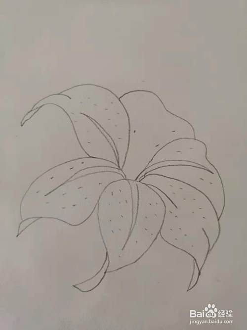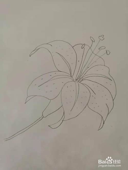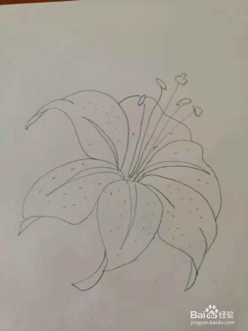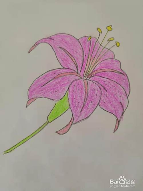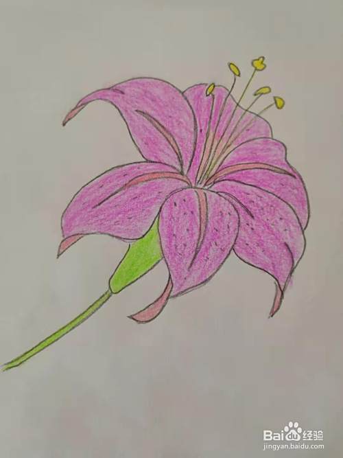 最后用彩铅给百合花上色,用黑色彩铅描边,这样百合花简笔画就完成了。