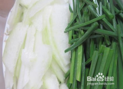冬瓜洗净切成片,韭苔洗净切成段,准备好葱姜丝蒜末。