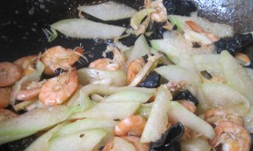 5.倒入冬瓜片一起翻炒至冬瓜的水分渗出,变软