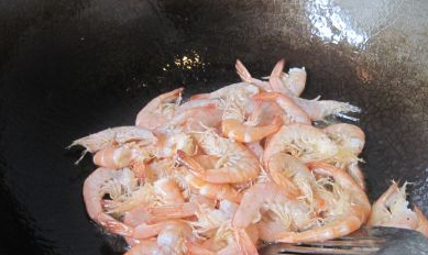 3.热锅入油等到油八分热时倒入小海虾大火快速翻炒,至虾皮变得酥脆