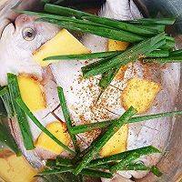 盘子底部铺上姜片和葱段。摆上鲳鱼上锅大火蒸12分钟。