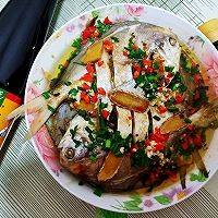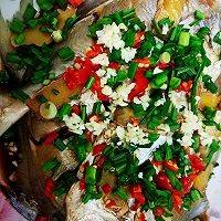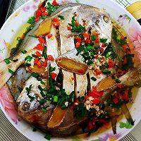 蒸好的鲳鱼倒去多余的汤汁。撒上葱蒜辣椒末。