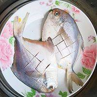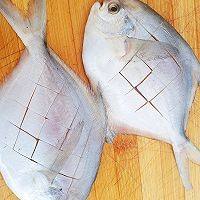 几条鲳鱼清洗干净改花刀。切点姜片,葱段备用。