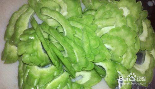 苦瓜从中间剖开,刮去瓤和籽,切成厚度约5毫米的薄片。