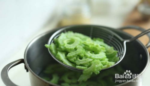 起锅烧水,水开后放入苦瓜片,开水焯3分钟,捞出沥干水分。