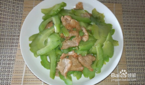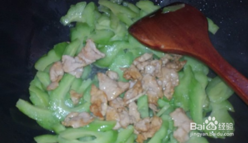 肉片变色后,倒入苦瓜片,加盐和生抽调味,翻炒一分钟后,加入鸡粉调味,美味的苦瓜炒肉就完成啦~