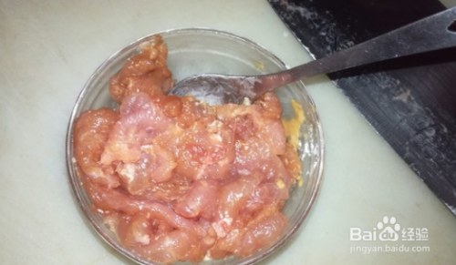 瘦肉切成片,放入生抽 料酒 食盐 生粉 鸡粉抓拌均匀,腌制十分钟。