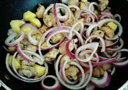 之后放入洋葱进行炒拌,如果过于干的话,可以放入一些水,当炒的6成熟的时候,放入青椒,进行继续炒。