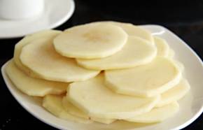 首先,我们将土豆洗好削皮后,切成片状,片不要太厚,但也不要太薄。