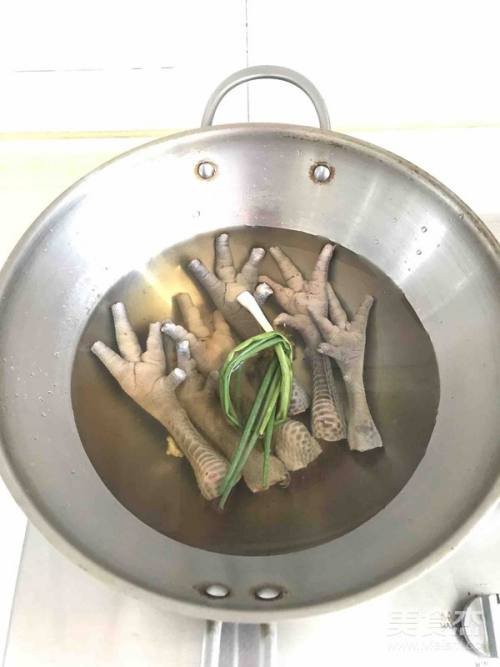 2把鸡爪放入锅中加水盖没,放入葱姜,加一勺黄酒。大火煮开,煮3-5分钟,捞出鸡爪,再次洗净。