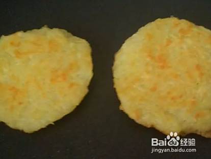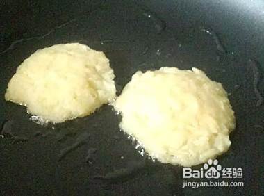 最开始先不要翻动土豆饼,小火慢慢煎到发出香味,就表示一面已经煎黄定型,可以晃动一下锅,给土豆翻面开始煎另一面。