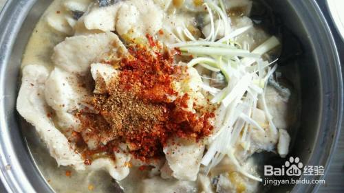 鱼片上放上辣椒面,有花椒粒放花椒粒,切碎了的蒜,葱丝。大料面。