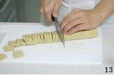 冻硬的面团取出来后,用刀切成0.5CM厚的片。