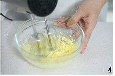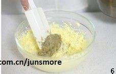 黄油切小块软化后,加入细砂糖,用打蛋器打发1分钟。
