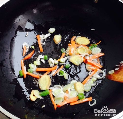 锅里中火烧热,下入葱花姜片,辣椒段爆香。
