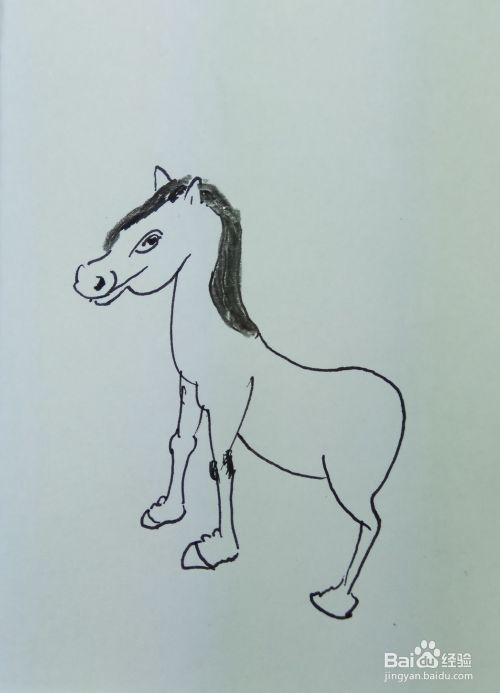 6.用水彩笔涂出小马驹的身体色彩,要尽量涂得均匀一些,有些地方要侧重涂一下,这样会更有立体感,修饰一下,简笔画就画好了。