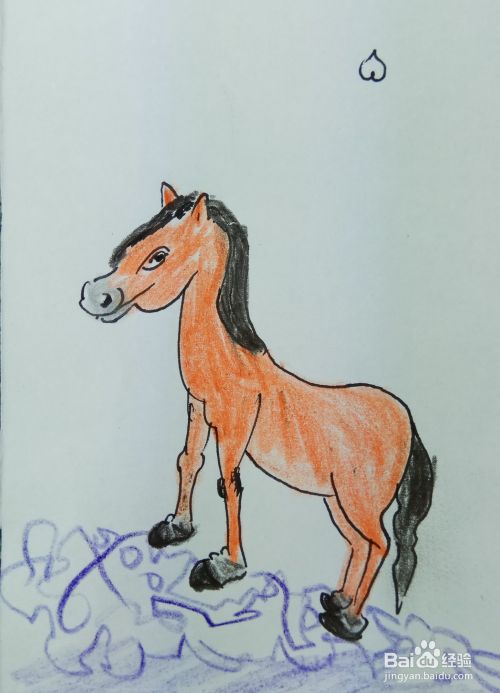 用水彩笔涂出小马驹的身体色彩,要尽量涂得均匀一些,有些地方要侧重涂一下,这样会更有立体感,画出背景部分,修饰一下细节,简笔画就画好了,感兴趣的朋友也可以来尝试画一下。