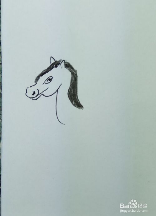 1.在白纸上用线条和曲线画出一只小马驹的头部轮廓,并画出的它眼睛,鼻子,嘴巴,耳朵和头顶上的鬃毛。