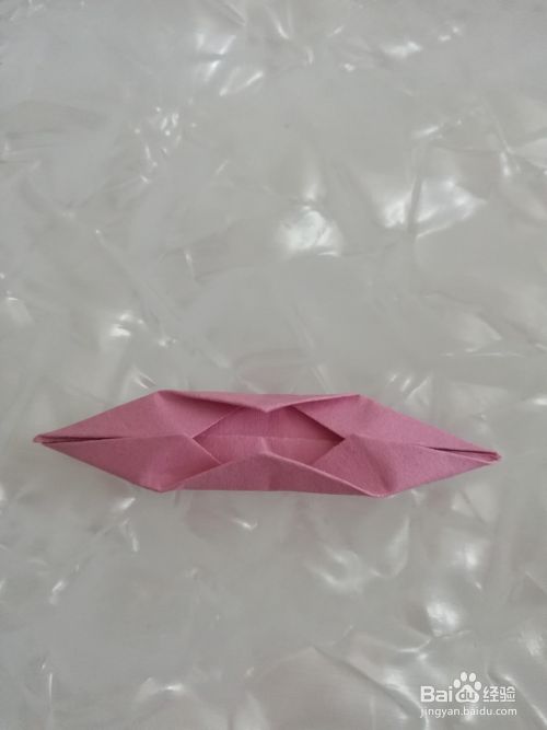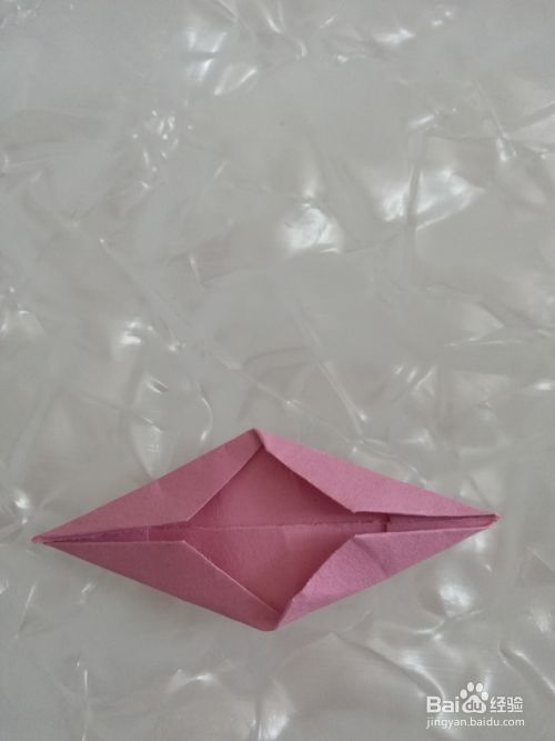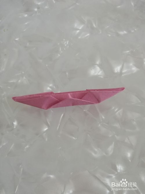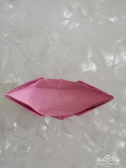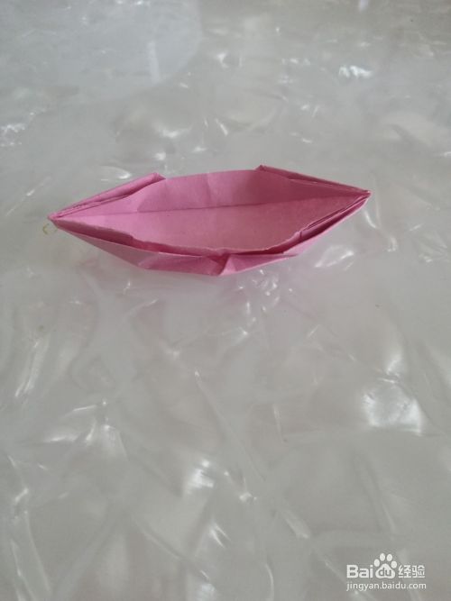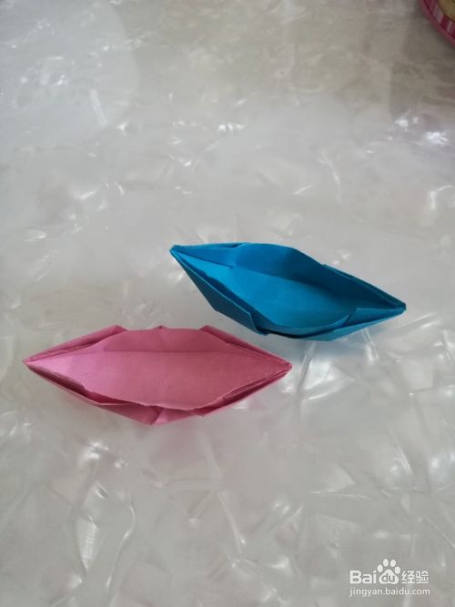 打开对折后的折纸,连个手指拉开中间部分,一个小船的形象就显示出来了,这样稍微的对两侧做一些调整,美丽的小船就完成了,多折几个不同颜色的小船来玩吧。