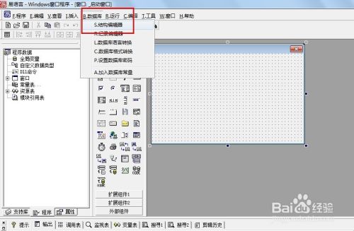 在“Windows窗口”设计界面,选择“菜单”→“数据库”→“结构编辑器”,弹出“数据库结构管理器”窗口,如图: