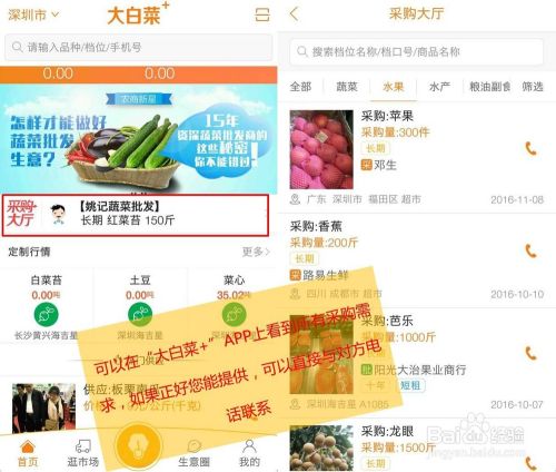 除了坐等别人与你联系购货,你也可以在“大白菜+”APP上翻看别人的采购需求,合适的话直接拨打对方电话洽谈