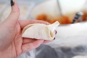 先把饺子皮对折,中间捏紧,再把右边往中间捏一下,形成两个瓣儿。