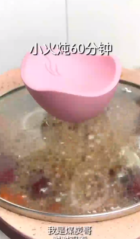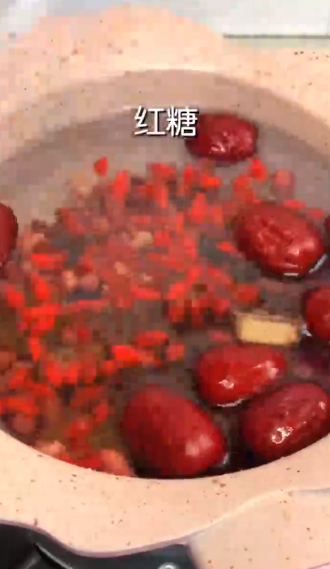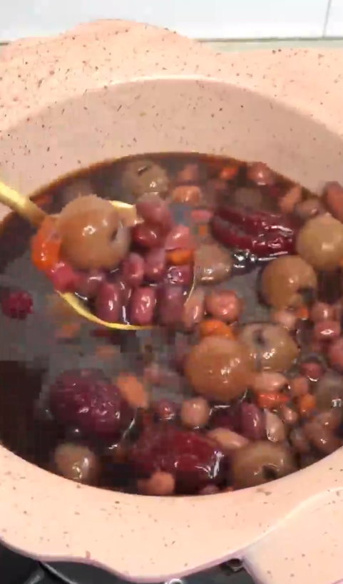 再放入红枣、枸杞、红豆、桂圆、花生、红糖。