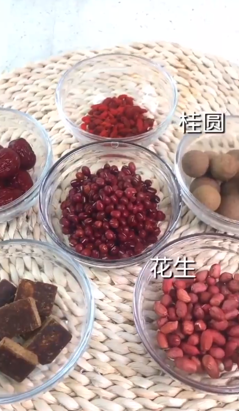 准备好红枣、红糖、枸杞、红豆、桂圆、花生。