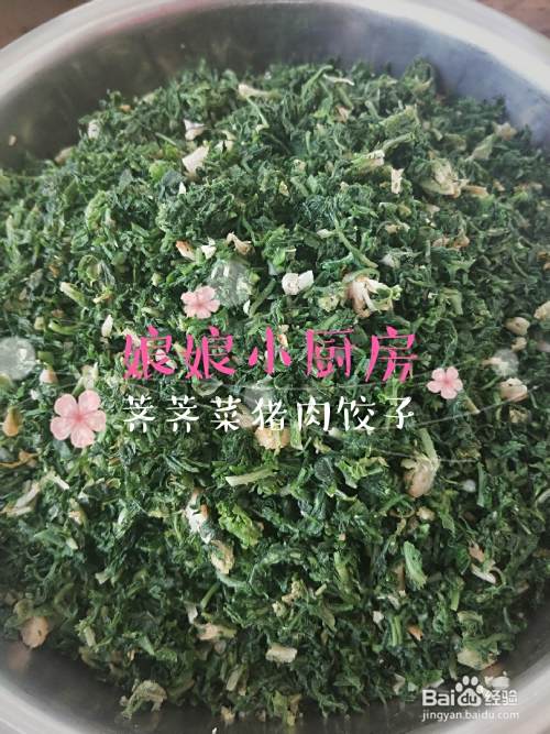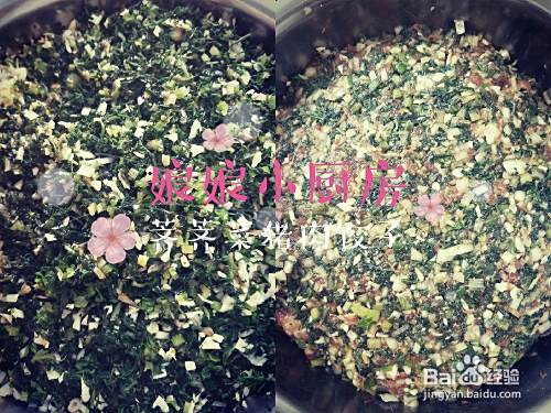 3.加入切碎的荠荠菜,熟油,再次拌匀。放置备用。