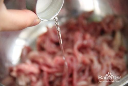 2、倒入料酒,用筷子搅匀。