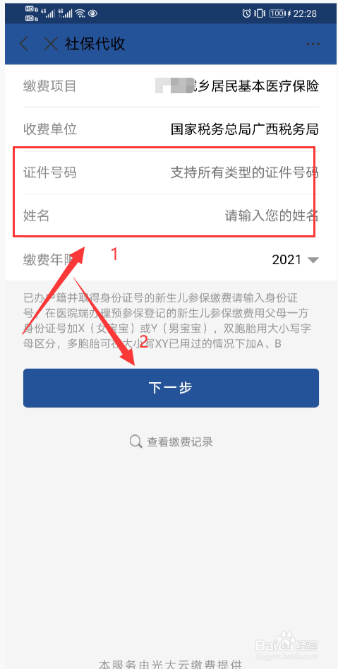 5.输入个人信息,再点击下一步,完成医保金额支付即可。