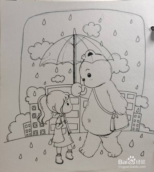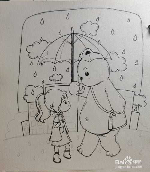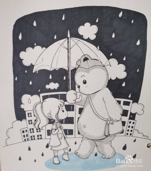 用勾线笔画出整个画面黑白的关系,涂上颜色。