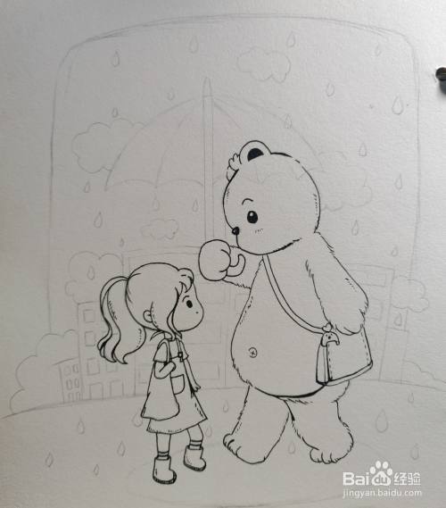 画小熊的时候要表现它身体毛绒绒的,所以线条要有虚实变化。
