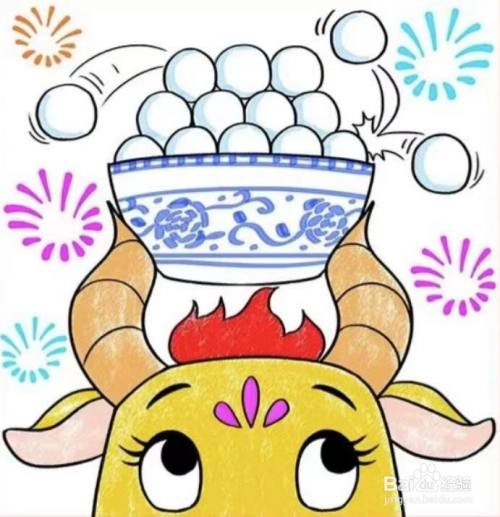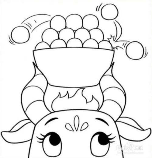 然后,画出牛头上顶着的一只大碗,碗里堆满了元宵,还有三颗元宵滚落到外面