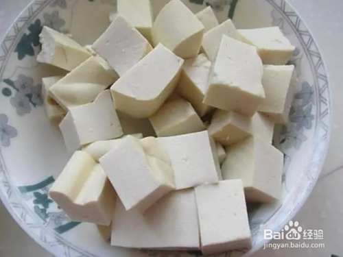 豆腐切成小块,放入沸水中焯1分钟,捞出沥水。