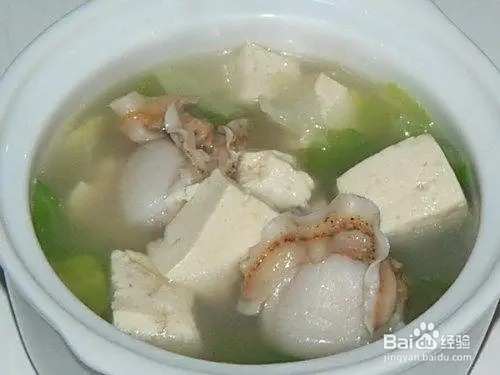 锅内放入少许油,放入葱花炒香,反顾热豆腐块和适量水大火烧开,放入扇贝肉煮2分钟。