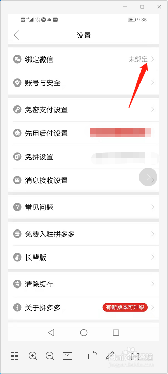 在拼多多软件中,可以点击打开设置界面,点击选择微信绑定选项,即可绑定微信账号。