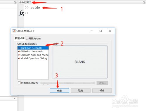首先在命令行窗口中输入“guide”指令,打开gui建立引导界面;然后选择“Blank Gui”生成模板;最后点击确定,完成新建