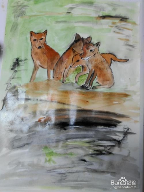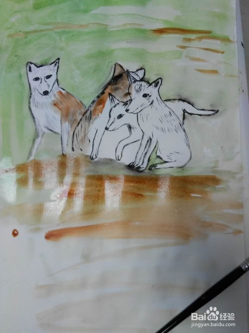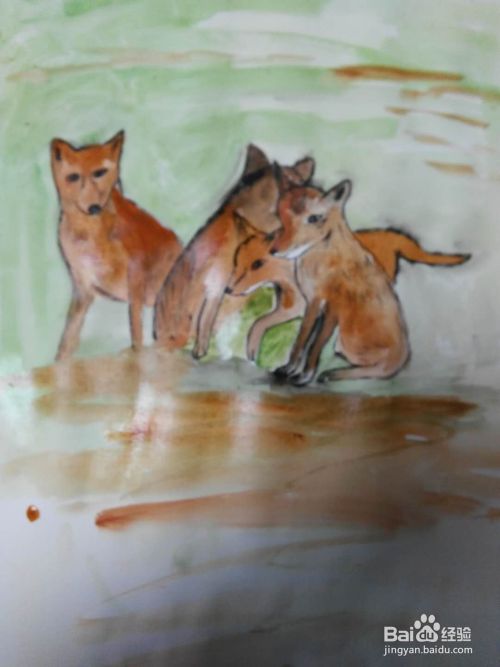 我们用一只大号毛笔,用些淡淡的绿色把背景色染一下。注意就能对比出狐狸身上的颜色。
