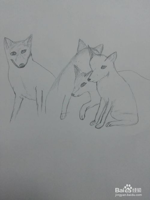 我们先用铅笔把多只狐狸的轮廓勾出来,正面的狐狸和侧面的狐狸呢,我们还是先从鼻子画,画出头部以后在画出身子和脚。有没画好的线条有橡皮搽去。
