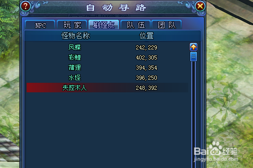 这个时候,就会出现自动寻路界面,在自动寻路界面点击刷怪点,然后点击凤蝶。现在,我们就向任务怪凤蝶跑去。