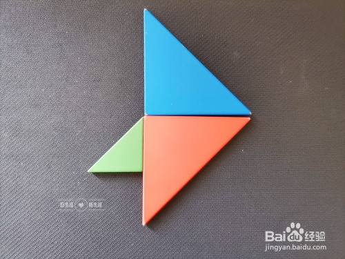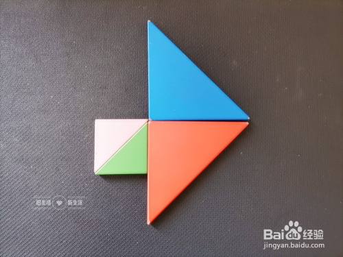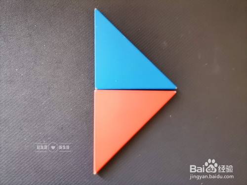 拿出两个大三角形红色和深蓝色,把它拼成下图的样子。