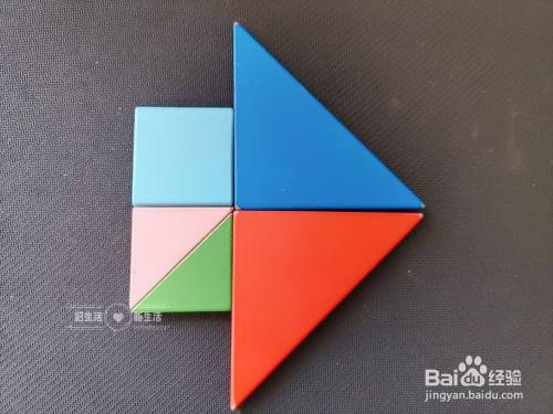 拿出一个天蓝色正方形放在粉色小三角形的上面,如下图所示。