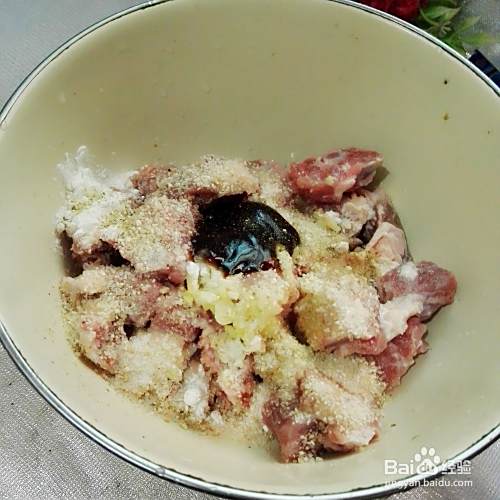 把五香米粉倒入控干水的排骨上,再放少量生粉,蚝油,鸡精,盐,再滴上几滴料酒。
