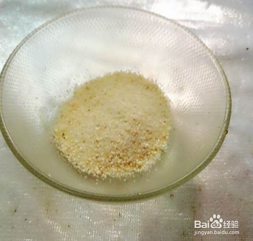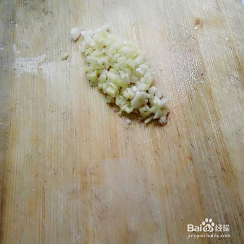 把大蒜籽用刀背拍下去皮再剁碎,用小碗倒50克五香米粉。本来要加上生姜的,后来没了,就放了几滴料酒。