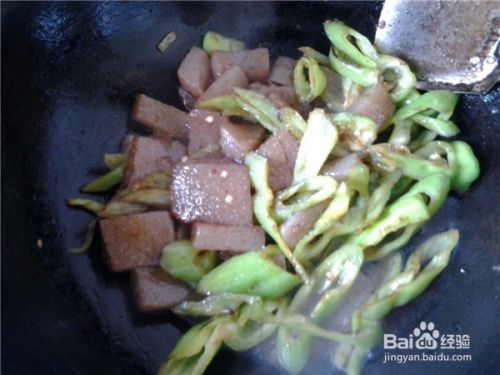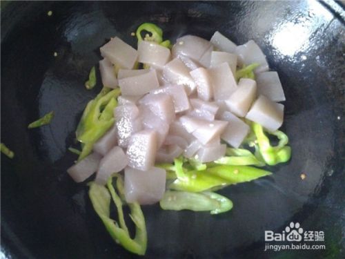 当闻到有辣味就倒入魔芋豆腐炒4分钟。