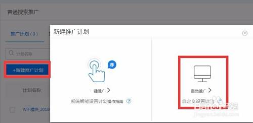 进入网销宝账号,点击新建推广计划,会弹出这样的图片,一键推广和自助推广位选择;