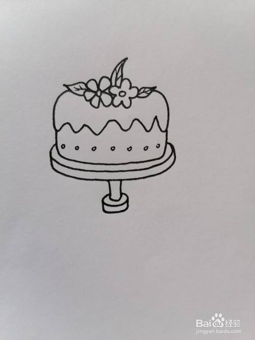 第一步,在纸上画两朵小花,在左中右三处画一片叶子,下面画一层奶油和一层蛋糕胚