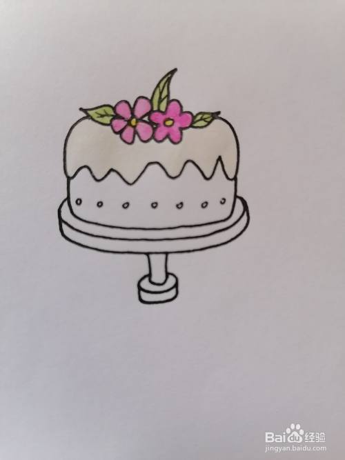 第四步,用朱红+白色水彩涂好蛋糕胚,用煤黑+白色水彩涂好蛋糕托,好看的鲜花蛋糕就画好啦