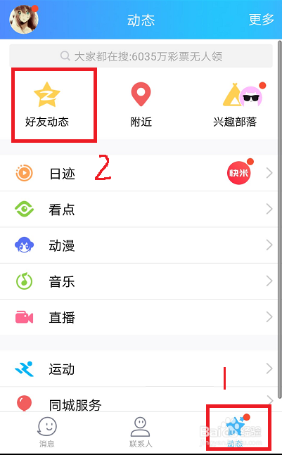 进入后,先点击“动态”(图中1),然后点击“好友动态”(图中2),打开它。